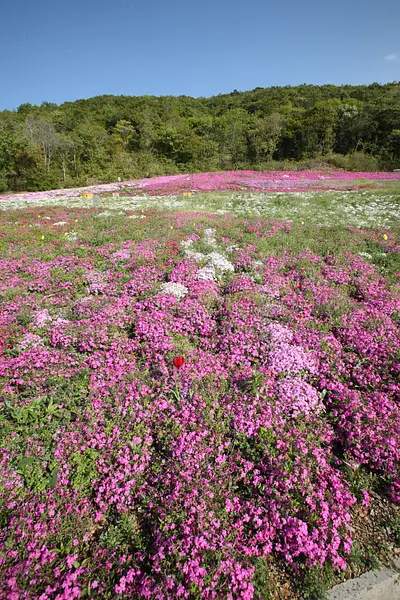 約3300坪の英虞湾をデザインした丘陵に、ボランティアの人たちにより植えられた約14万株の赤・白めビンクの花が咲き誇る。