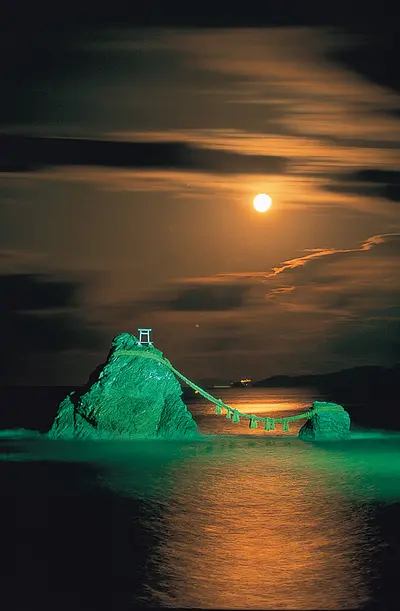 夫婦岩の日の出のシーンは良く知られていますが、10月~2月の満月の頃には、夫婦岩の間から月の出を見ることができます。西行や芭蕉、本居宣長らも夫婦岩の美しさにひかれて、多くの歌を残しています。