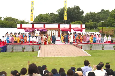"王朝絵巻を再現する斎王群行を始め、禊の儀、太鼓、斎王の舞、斎王市、花菖蒲展など多彩な催しが行われる。 "