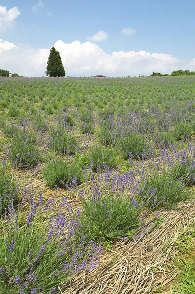 "最盛期には5万株のラベンダーが咲き誇り。薄紫の絨毯を敷いたような風景が広がり、あたり一面にふくよかな香りが広がります。 "