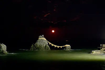 伊勢志摩を象徴する風景のひとつで、二見興玉神社のご神体「興玉神石」の鳥居の役目も果たす二見浦・夫婦岩。毎年10月~1月の満月の頃、夫婦円満のシンボルである夫婦岩の中央から月が昇ります。