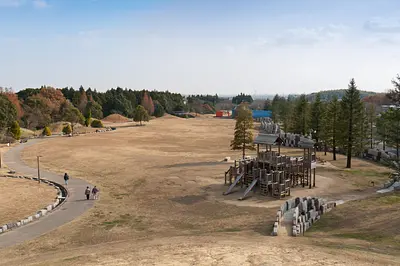 面積は38,300㎡で、空間創造の主題は「開放性のある雄大な大地に21の景観創出の丘をつくる」です。 開放性のある起伏に富んだ緑の大地と、それらと連続する水の流れが魅力的な広場です。木造遊具や広大な芝生の広場があり、ファミリーには楽しい公園です。