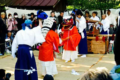 年中西日本を中心に回っている社中が、毎年12月24日午後に、太夫の増田神社に集合し全曲奉納します。獅子舞と放下という曲芸で、修行を重ねたプロの技とチャリと呼ばれる道化役の息の合った曲芸に、観衆は大きな笑い声をあげています。桑名では4月2日には大福田寺、10月23日には神館神社でも奉納されます。国重要無形民俗文化財指定。 勇壮な【しし舞】【皿回し】【軽業】など曲芸も披露され、静かだった境内に熱気があふれます。