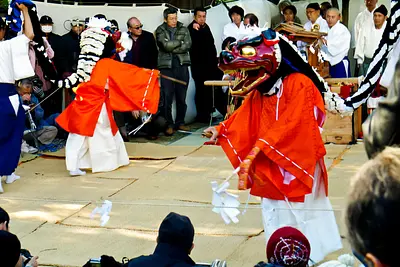 年中西日本を中心に回っている社中が、毎年12月24日午後に、太夫の増田神社に集合し全曲奉納します。獅子舞と放下という曲芸で、修行を重ねたプロの技とチャリと呼ばれる道化役の息の合った曲芸に、観衆は大きな笑い声をあげています。桑名では4月2日には大福田寺、10月23日には神館神社でも奉納されます。国重要無形民俗文化財指定。 勇壮な【しし舞】【皿回し】【軽業】など曲芸も披露され、静かだった境内に熱気があふれます。