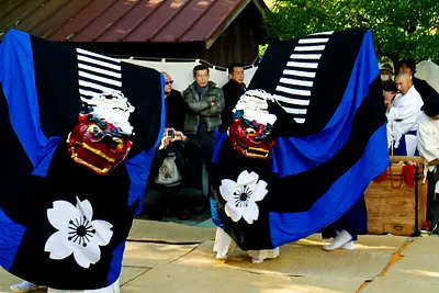 年中西日本を中心に回っている社中が、毎年12月24日午後に、太夫の増田神社に集合し全曲奉納します。獅子舞と放下という曲芸で、修行を重ねたプロの技とチャリと呼ばれる道化役の息の合った曲芸に、観衆は大きな笑い声をあげています。桑名では4月2日には大福田寺、10月23日には神館神社でも奉納されます。国重要無形民俗文化財指定。 勇壮な【しし舞】【皿回し】【軽業】など曲芸も披露され、静かだった境内に熱気があふれます。