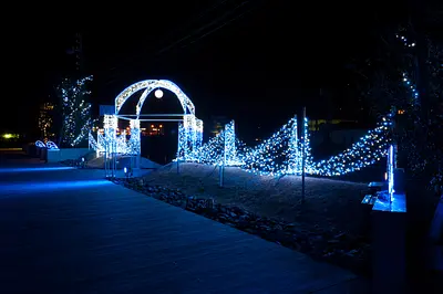鳥羽駅前「カモメの散歩道」でBijou de Mer 海の宝石たちと題して新イルミネーションが登場しました。青と白のマリンカラーで、真珠の輝きをモチーフにした「月の雫のゲート」をはじめ、ウミホタルをイメージしたオブジェや波のオブジェが連動し動きのある光を演出しています。