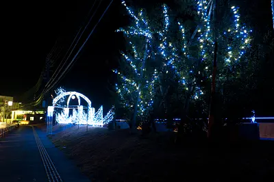 鳥羽駅前「カモメの散歩道」でBijou de Mer 海の宝石たちと題して新イルミネーションが登場しました。青と白のマリンカラーで、真珠の輝きをモチーフにした「月の雫のゲート」をはじめ、ウミホタルをイメージしたオブジェや波のオブジェが連動し動きのある光を演出しています。
