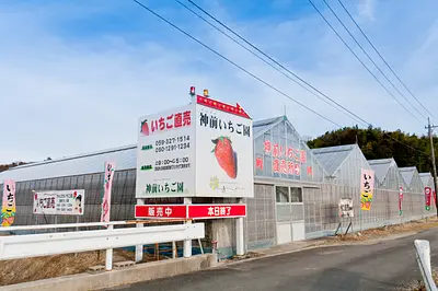 立ったままでも摘みやすいようにと高設栽培の約330平方メートルの暖かいハウス内で「章姫」を栽培しています。 価格は摘んだ分だけの量り売りです。