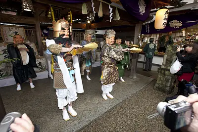 蛭子神社の祭礼。「えべっさん」の愛称で親しまれています。 七福神が町内を練り歩くほか、山の幸と海の幸の物々交換の名残といわれるハマグリ市が多くの露店と共にならびます。 神社では、ネコヤナギに大判小判などの縁起物をつけた「吉兆(けっきょ)」が授与されます。