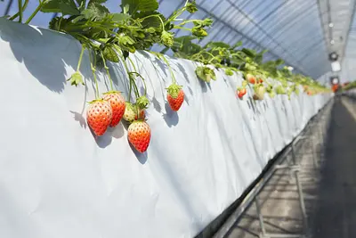 暖かいハウスの中で、章姫・栃乙女の2品種を栽培しています。