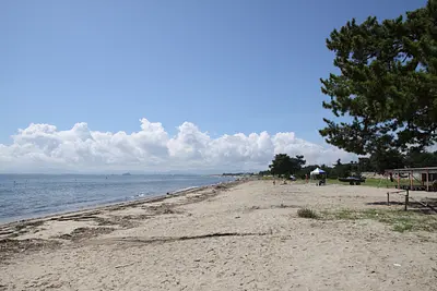遠浅の海岸線が2kmにもわたって続く、伊勢の海県立自然公園の南端に広がる美しい浜辺。利用料金無料のキャンプ場とも隣接しています。