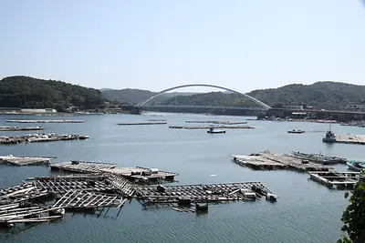 パールロードの今浦と本浦を結ぶユニークな工法によって作られたアーチ型のかけ橋。みごとな風景に心奪われる。鳥羽十景の1つ。