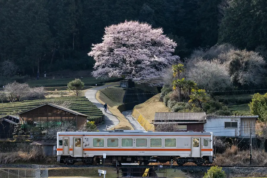 朝日に照らされた美しい淡墨桜の前を名浜線の電車が通っていきました。