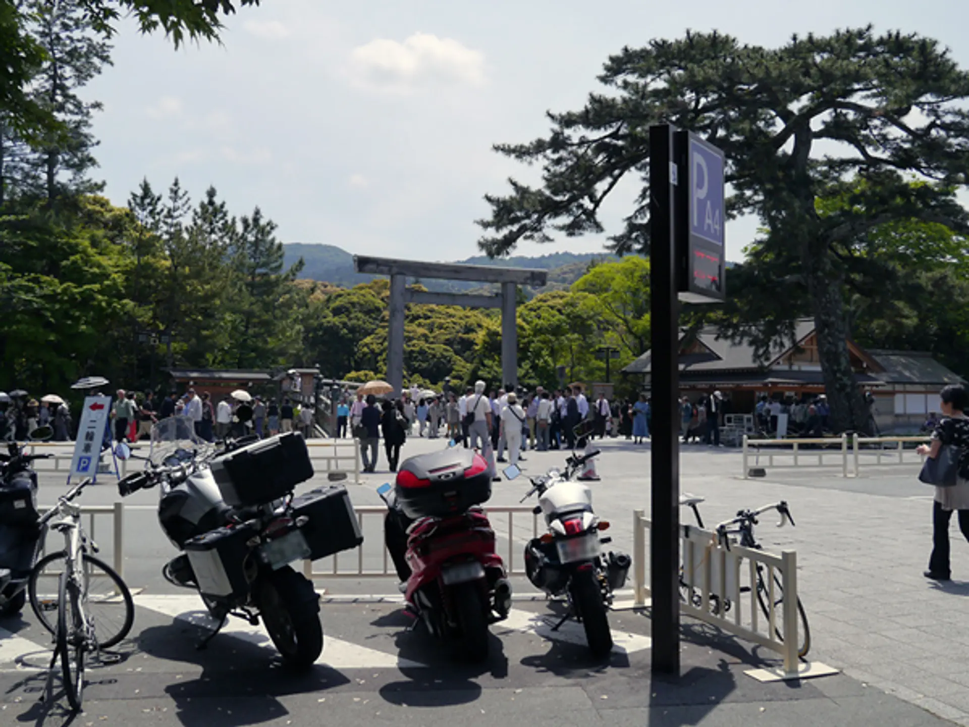 まずは外宮さんからスタート。外宮さんには正面入り口奥(写真の右奥)に駐輪場がありますので、そこに停めましょう。まずはせんぐう館を見学し、外宮さんを参拝します。