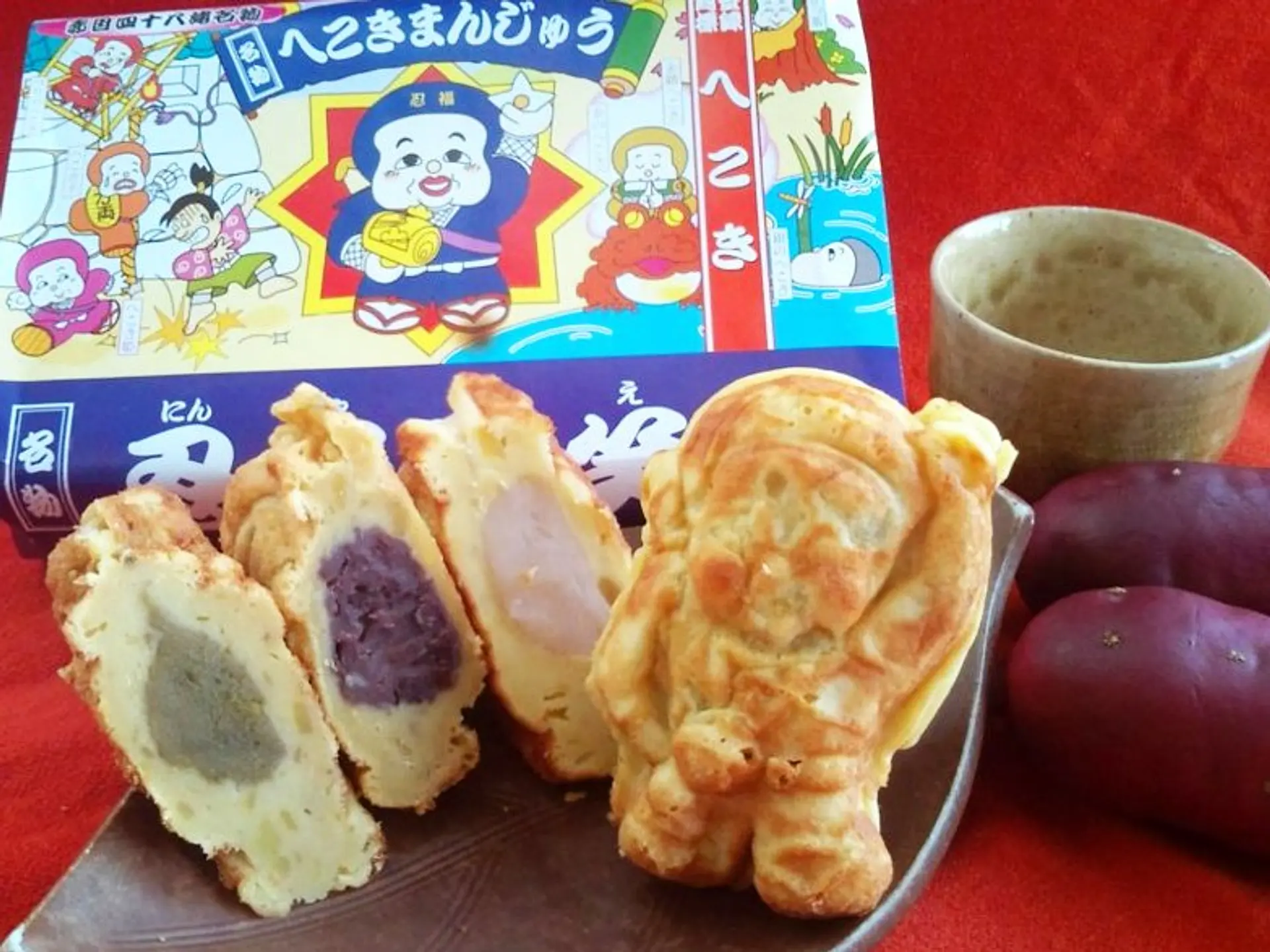 へこきまんじゅうはさつまいもの生地で焼き上げた忍者の形をしたおまんじゅう。味は全部で7種類あり、さつまいもならではのホクホク感と優しい甘さがたまらない絶品スイーツです。