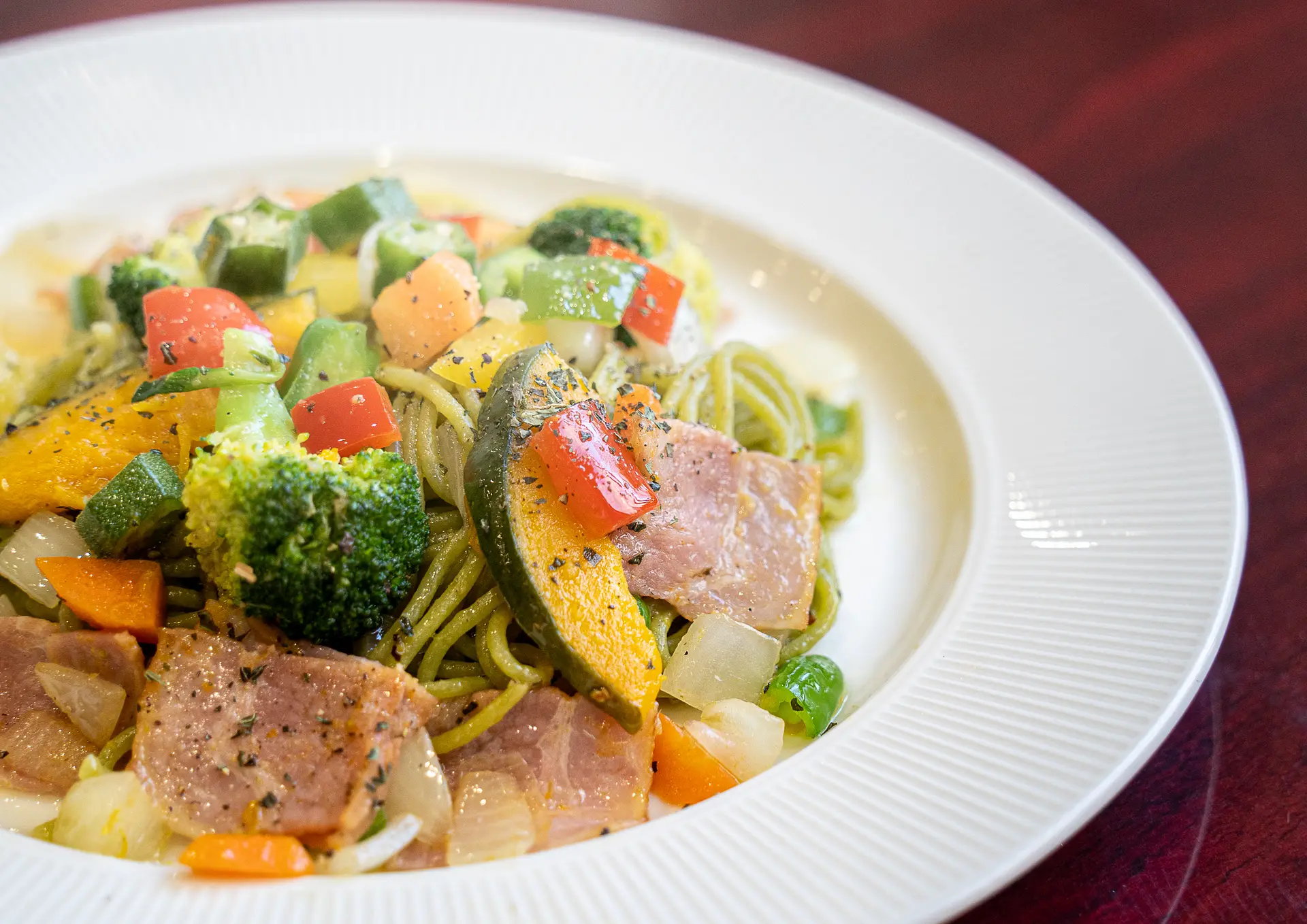 「オリーブジンジャーベーコンと野菜のパスタ」は、季節の新鮮野菜たっぷりのメニューで、麺自体に練りこまれた野菜の風味が香るヘルシーなパスタ!