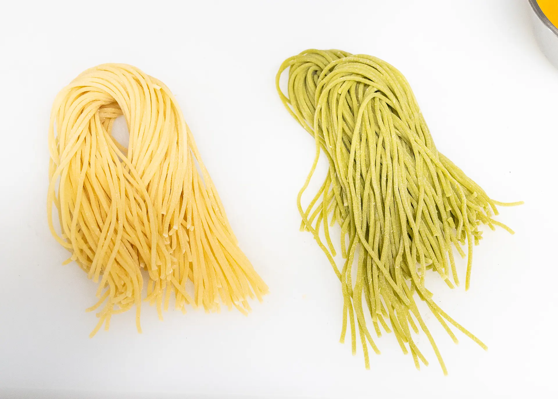 乾麺のように保存は効きませんが、乾麺にはないモチモチとした食感と、麺に練りこまれた素材の風味が引き立つのが特徴です。