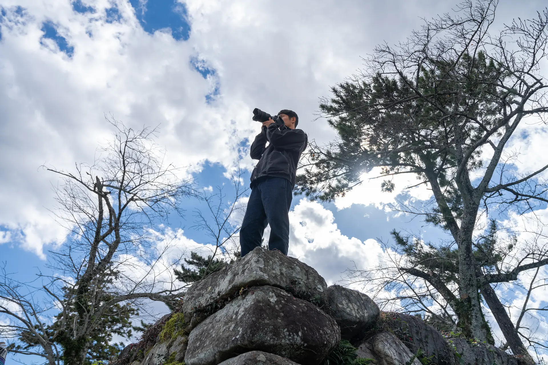 野面積みの天守跡に登り、カメラを構える浅田政志さん。