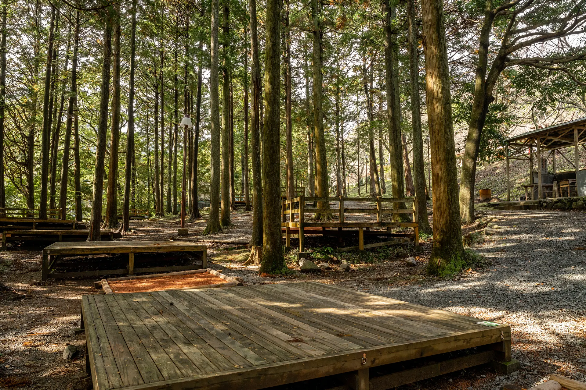 テントサイトにはウッドデッキ式テント台があり、テントを張る際、ペグを打たずに金具に結び付け、簡単に設営できるようになっています。