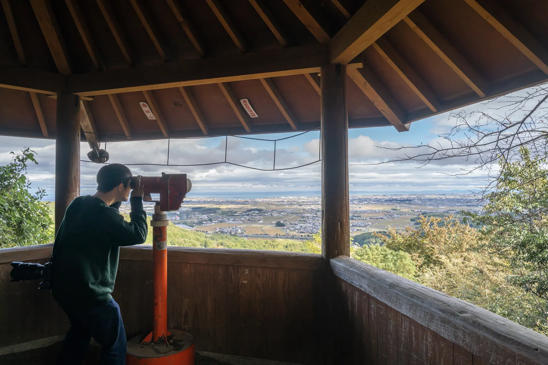 15分ほど登山道を歩き、展望台に到着しました!さっそく景色を楽しむ浅田政志さん。