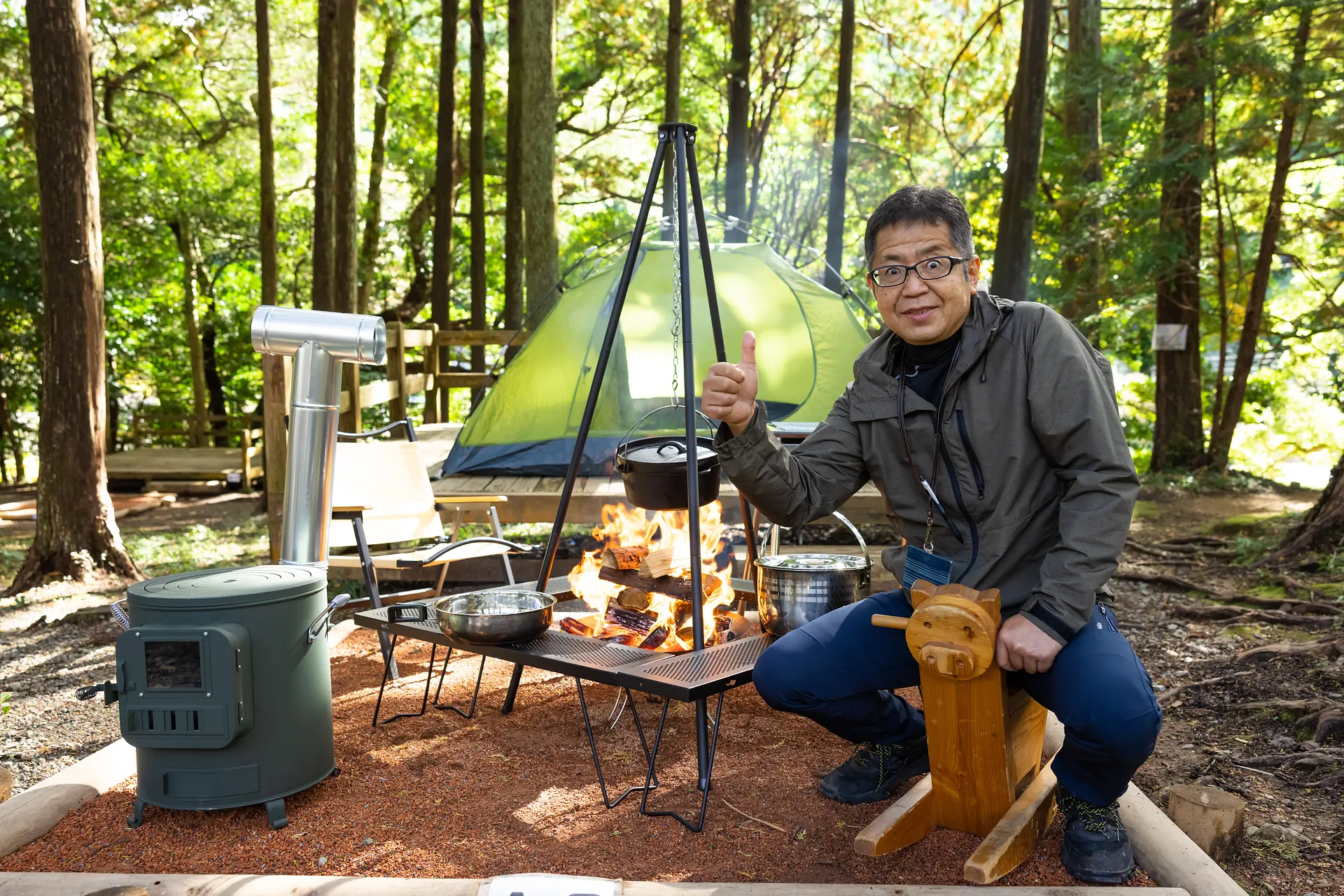 テントやキャンプグッズ、焚火と共に元気いっぱいの表情で撮影。休日は社員に誘われて山登りに行くんです、という岩森園長。明るいお人柄が社員人気の秘訣かもしれません。