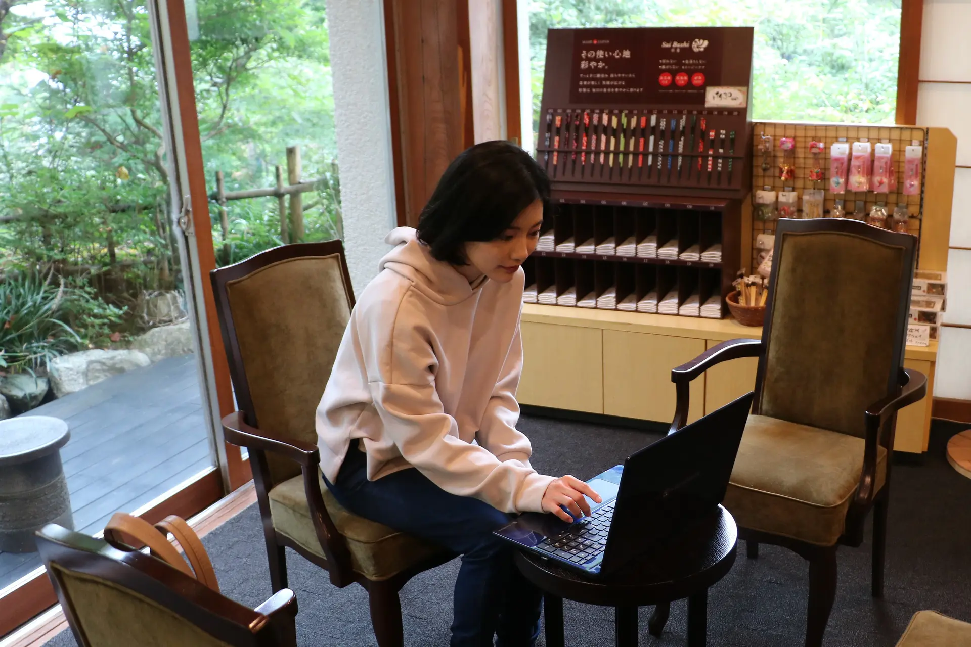 旅の始まりは、旅館「寿亭」!羽を伸ばして、出かける前にまずはお仕事を片付けておきましょう