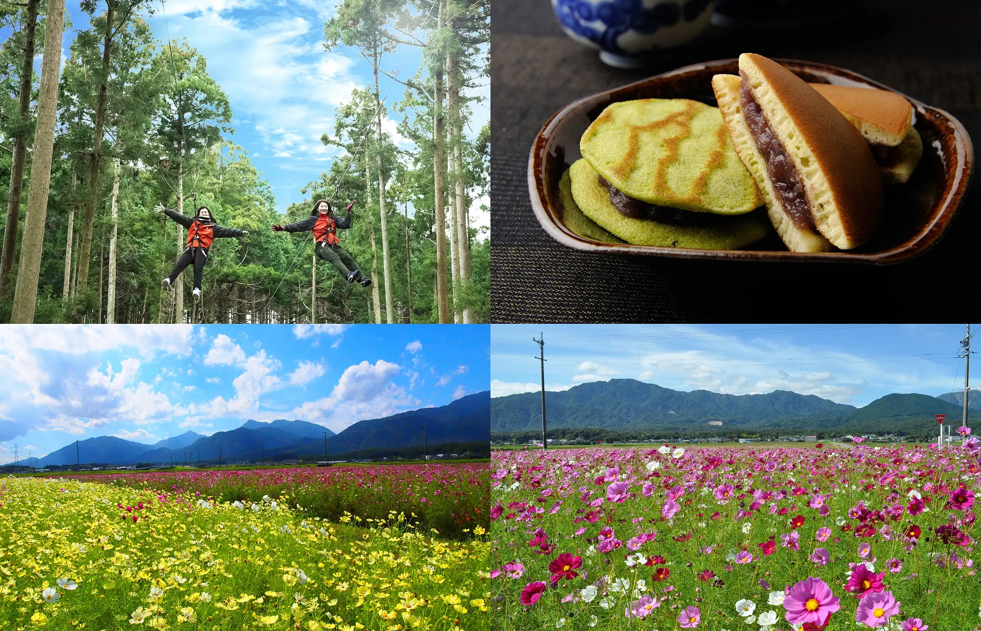 菰野町には、このあと紹介する「御在所ロープウエイ」以外にも樹上体験ができる「フォレストアドベンチャー・湯の山」や、毎年美しいコスモスが咲き誇る「田光のコスモス畑」など注目すべきスポットがたくさん!