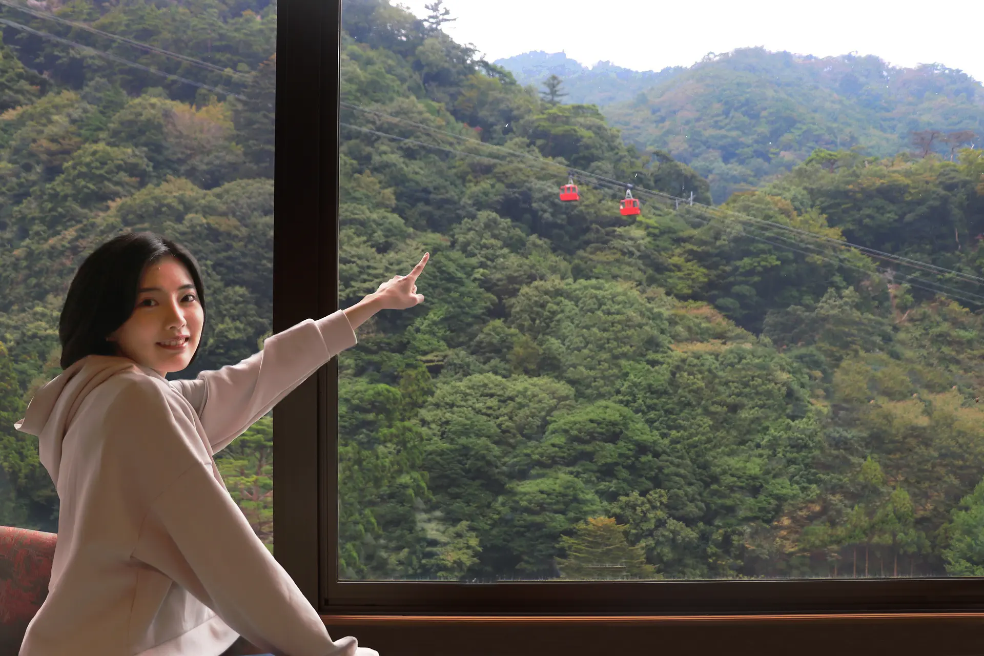宿泊するお部屋からは、「御在所ロープウエイ」が見え、窓にはまるで絵画のような景色が広がります。