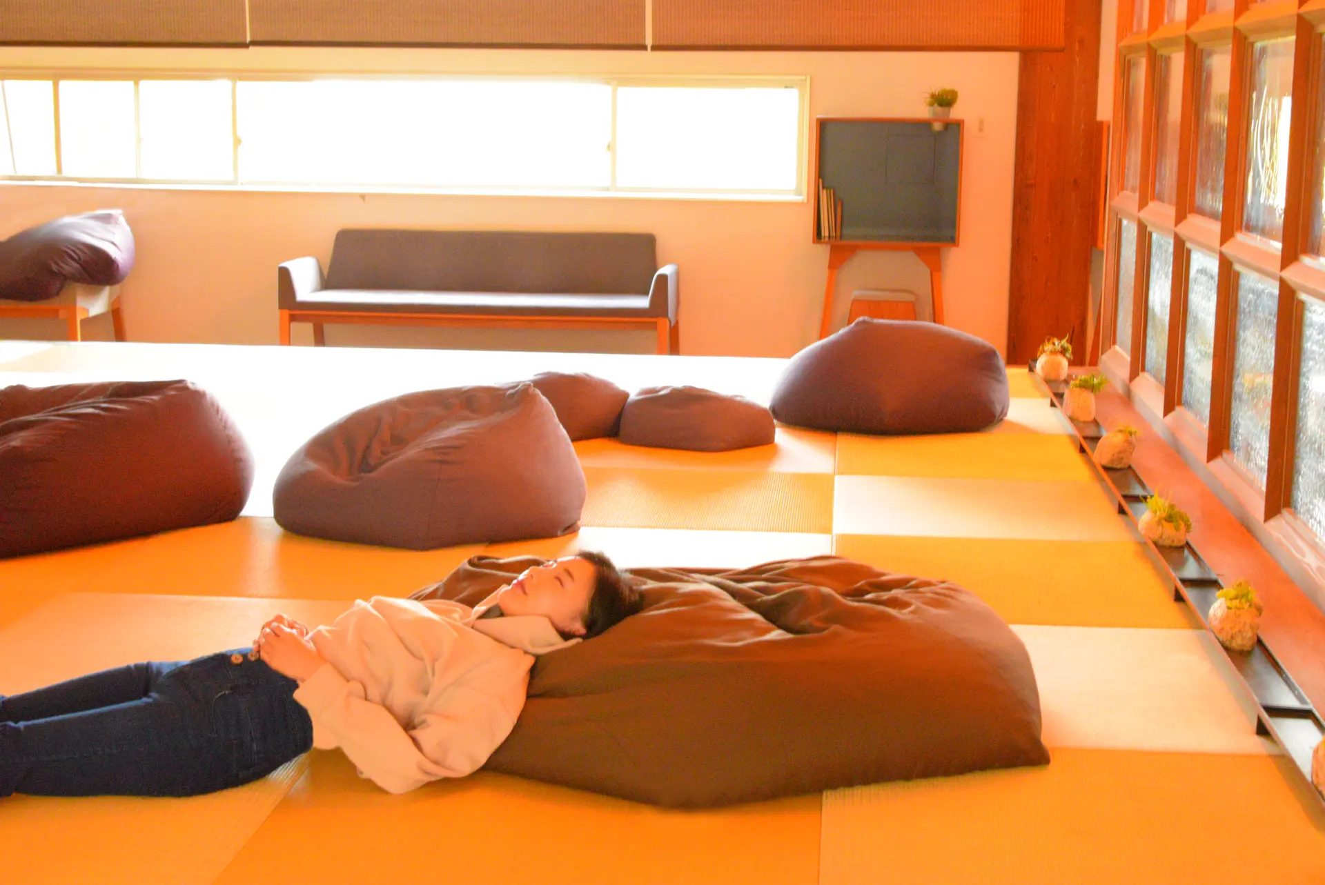 皆さん好きな場所でくつろぎながら、腰掛けたり、寝そべったり、うたた寝したり…。思い思いのリラックスを楽しめる、素敵な癒し空間です!