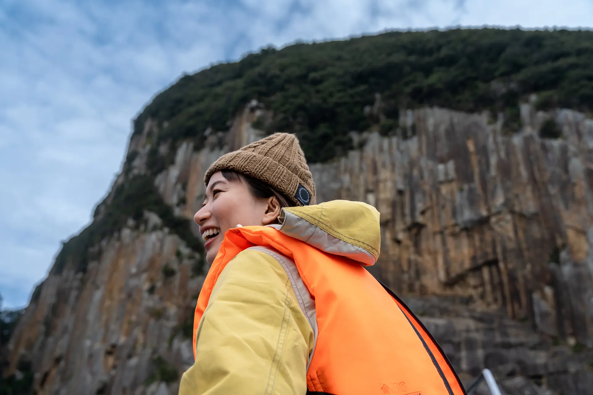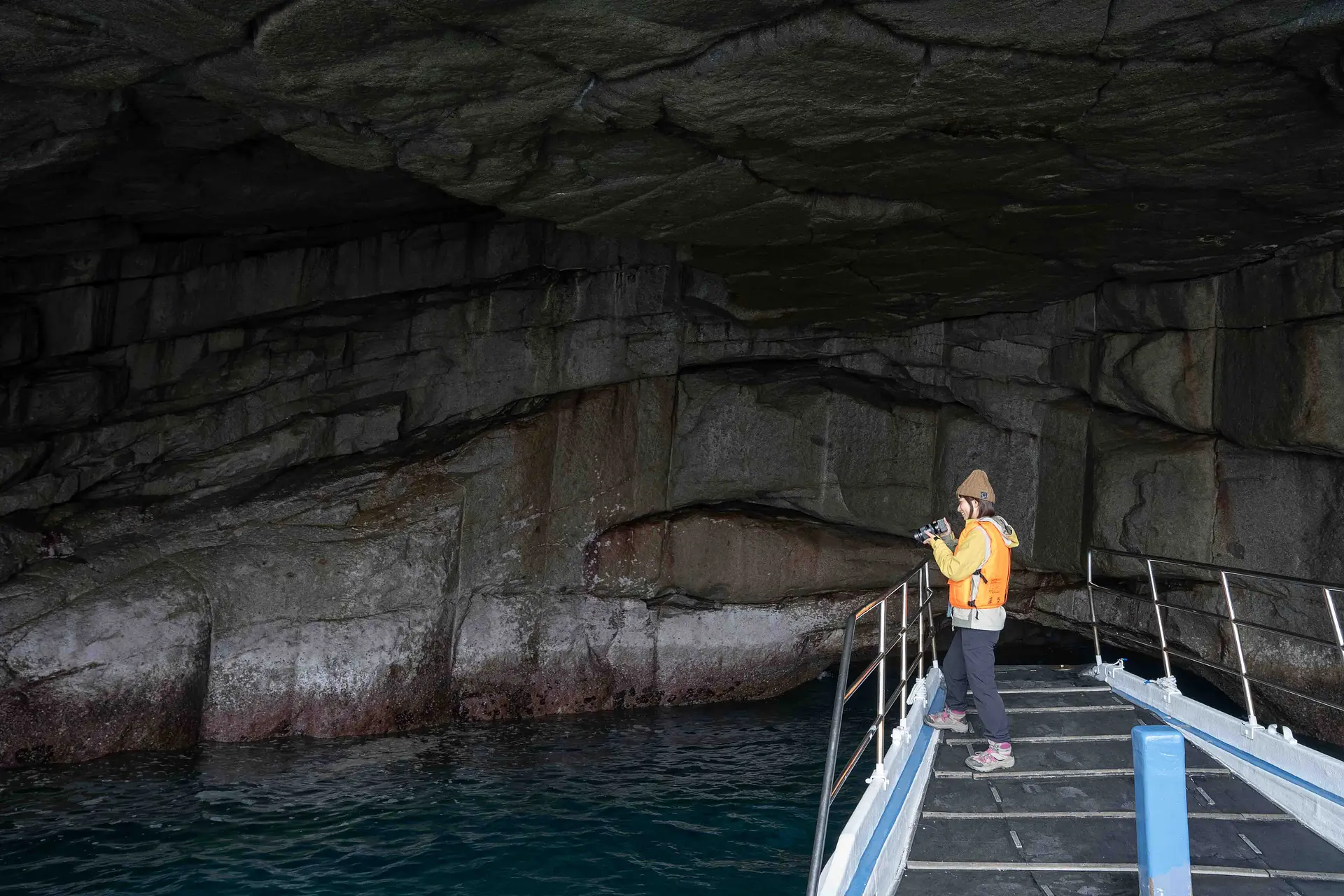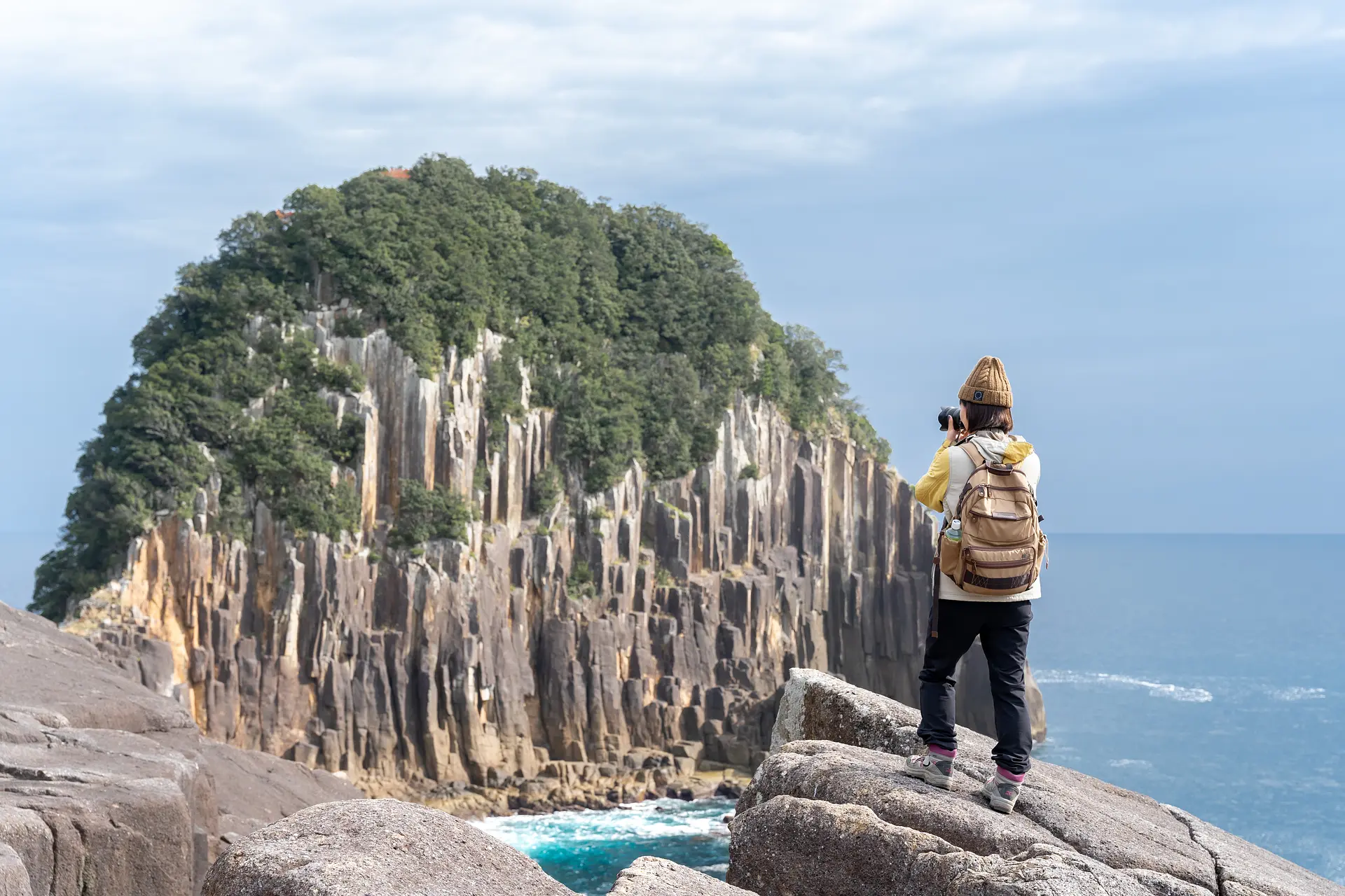 遊覧船で楯ヶ崎(たてがさき)に到着しました。約1400万年前の大規模な火山活動で発生した大量のマグマが冷却固結されてできた柱状節理(ちゅうじょうせつり)は圧巻!神武天皇が上陸した地とも伝えられており、神話の地としても有名です。