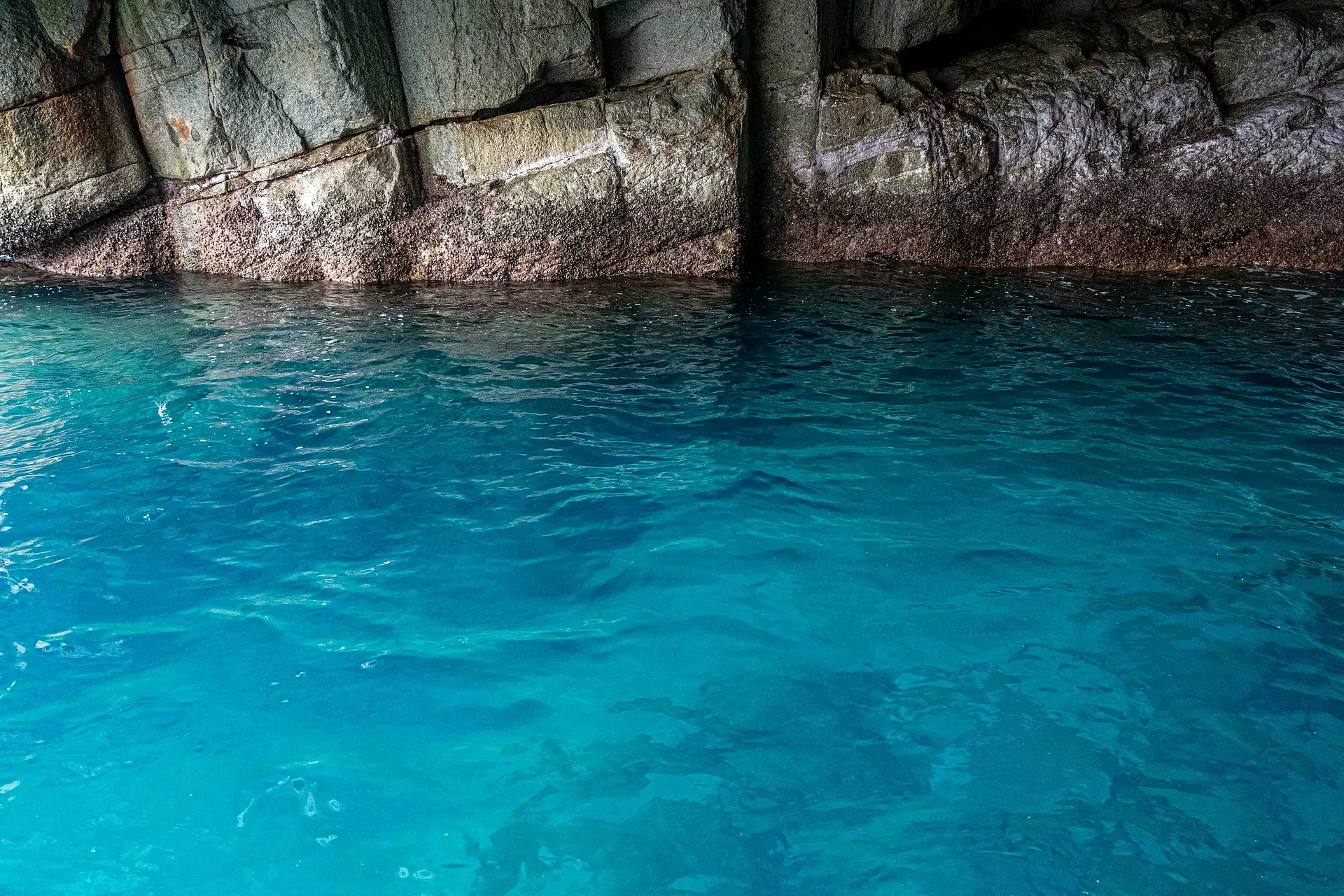 船で洞窟の中へと入っていきます。青の洞窟(ガマの口)の中では、太陽光線が海底に反射して、海面の色が鮮やかに光るため、その日の天候次第で色味が微妙に変わるそう。
