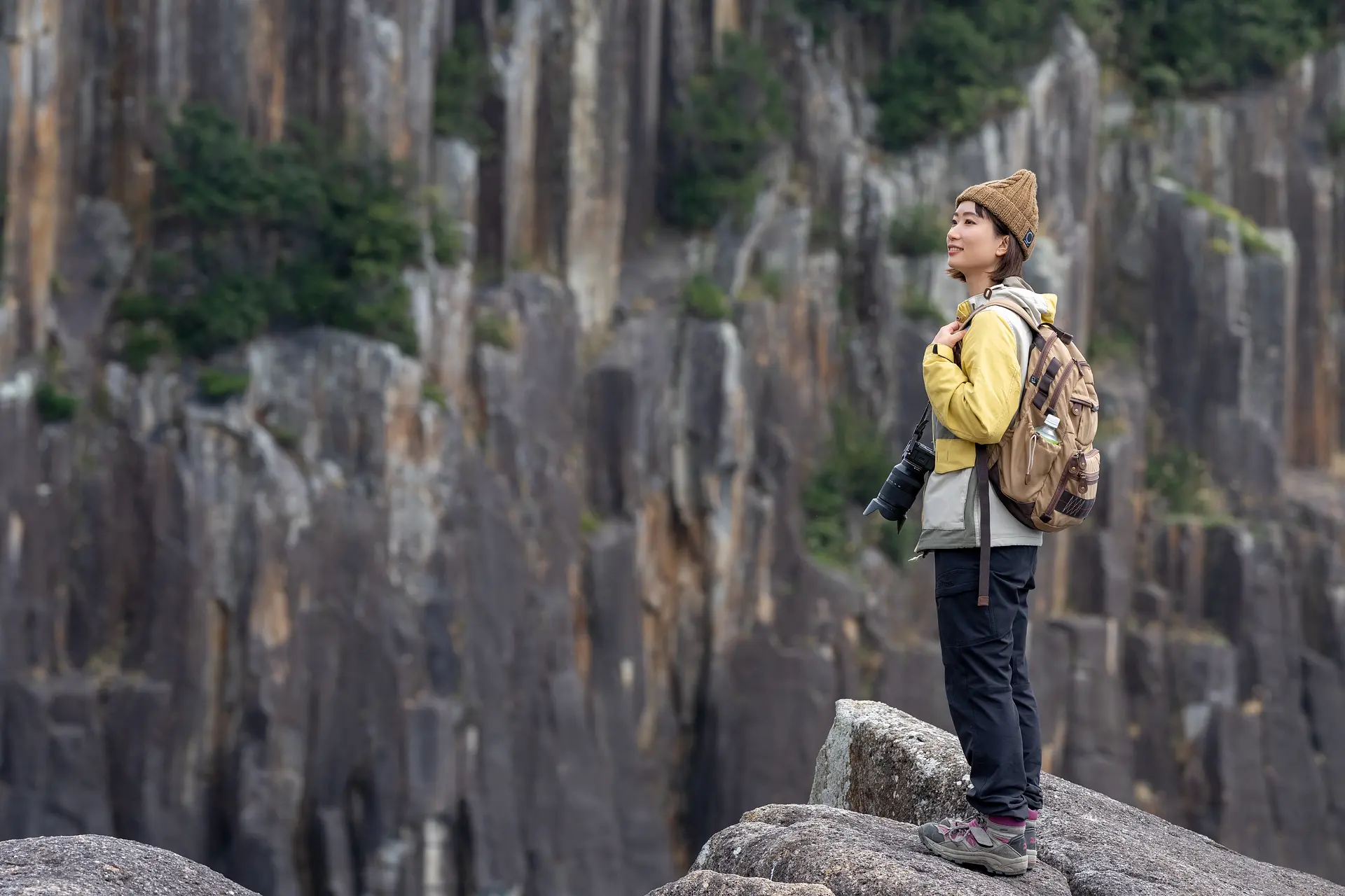千畳敷の先端に立ち、楯ヶ崎を撮影する詩歩さん。楯ヶ崎に向かってカメラを構える後ろ姿がカッコいいです!