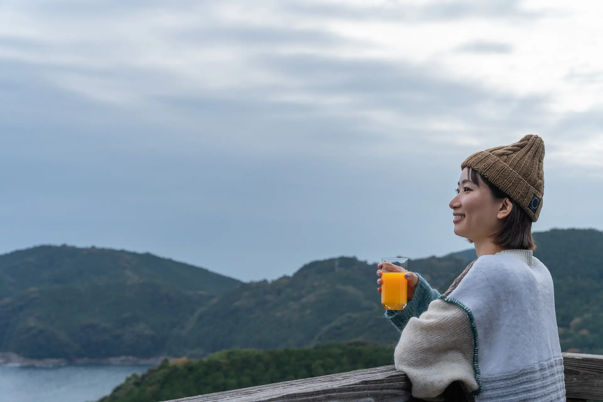 詩歩さん「甘みと酸味がちょうどいい。目の前に広がる山や海を見ながらご当地みかんジュースを飲めるなんて、最高ですね♪」