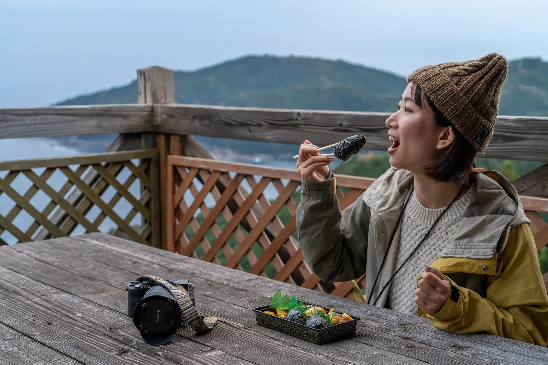 「ご飯を包んである高菜の塩加減が絶妙で美味しいです!」と詩歩さん。この地域ならではのものを食べる、旅の醍醐味ですね!