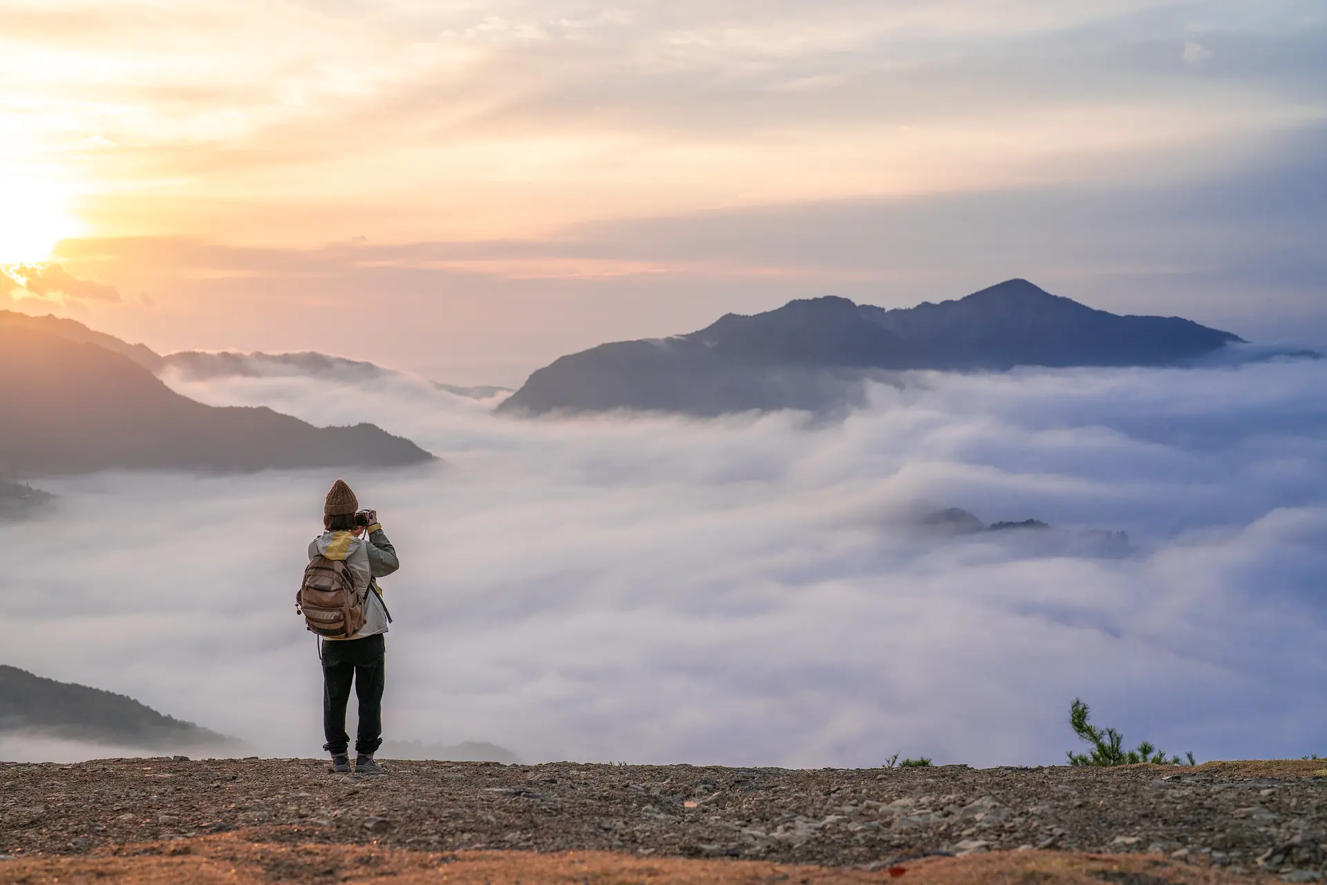 早起きして、朝6時30分頃にツエノ峰に到着。すると、眼下には山々を覆うように雲海が!雲海は天候などの条件が整わないと見ることができない、レアな絶景なんです。ツエノ峰では11月~2月の晴れた早朝に雲海が出現しやすいそう。さらに、前日夜と当日朝の寒暖差が大きいと、出現率が高まるとのこと。天候をチェックしてツエノ峰に足を運んでみてください。