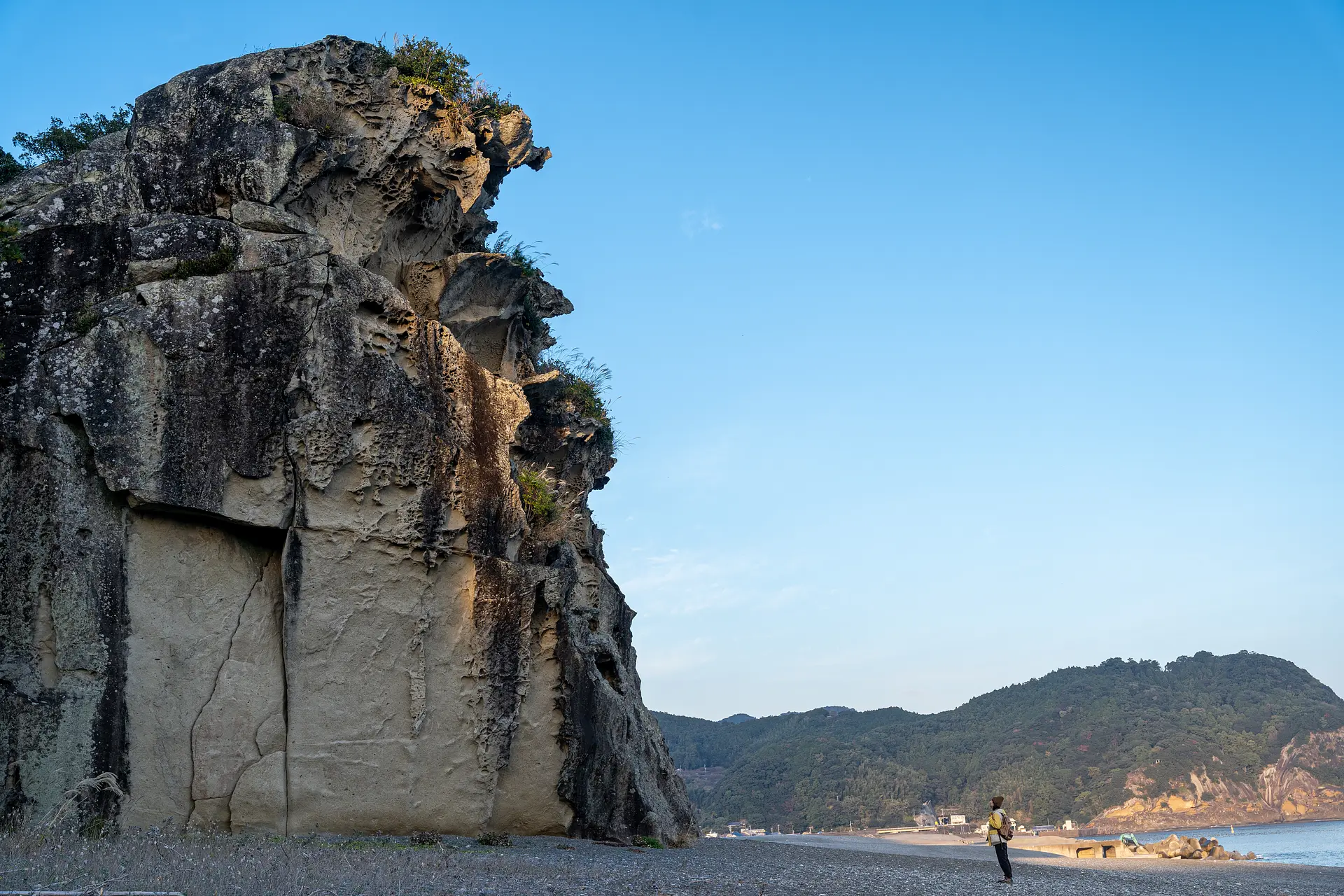 花の窟神社から徒歩10分ほどの場所にある絶景スポット・獅子岩。獅子岩は世界遺産や、国の名勝・天然記念物に指定されています。熊野灘に向かって獅子が吠えているような姿は、地盤の隆起や、海蝕減少によってつくられたそうです。