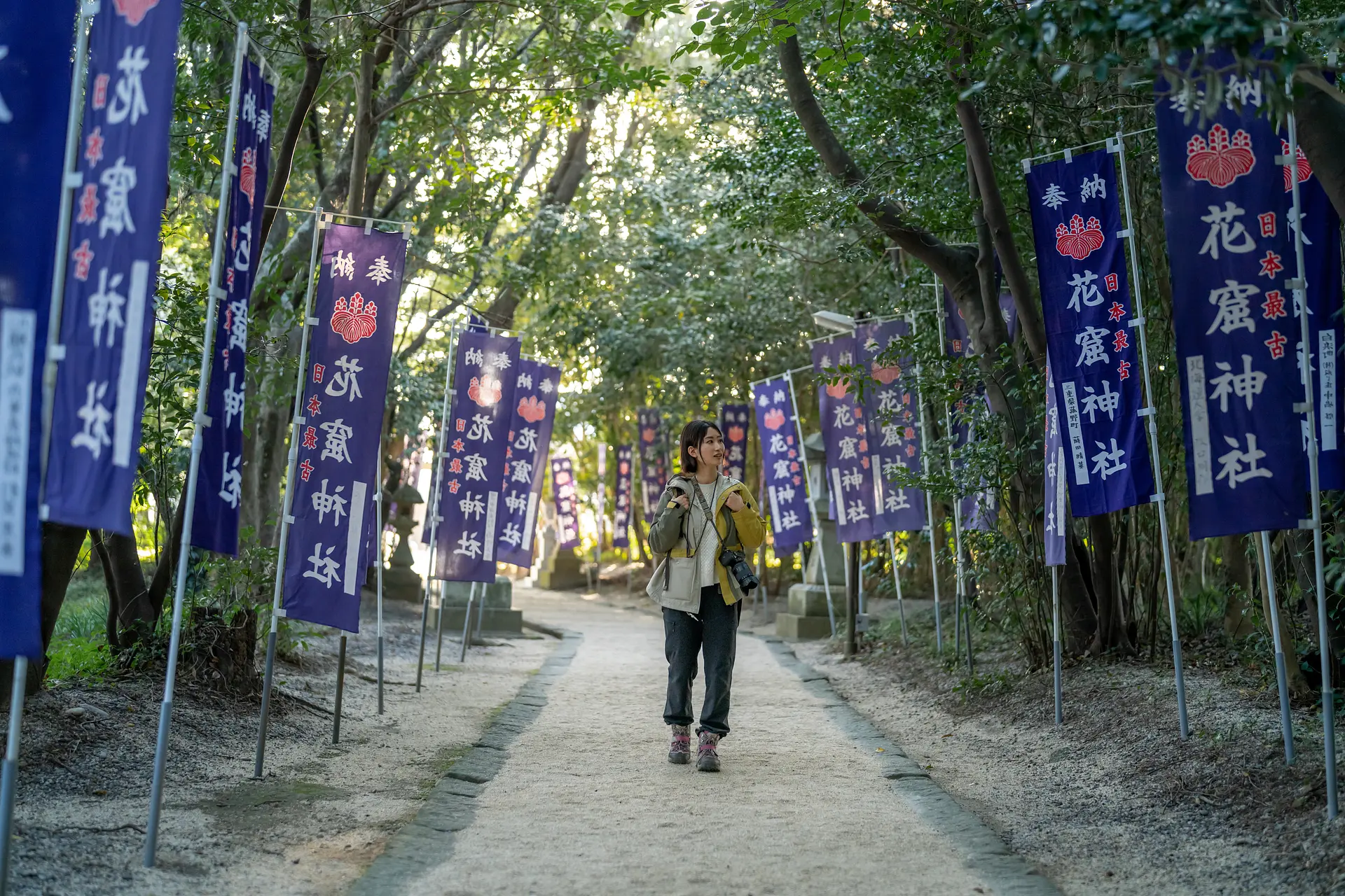 次は、「日本最古の神社」といわれている「花の窟(はなのいわや)神社」を訪れました。木々や、奉納旗が立ち並ぶ参道を進んでいきます。