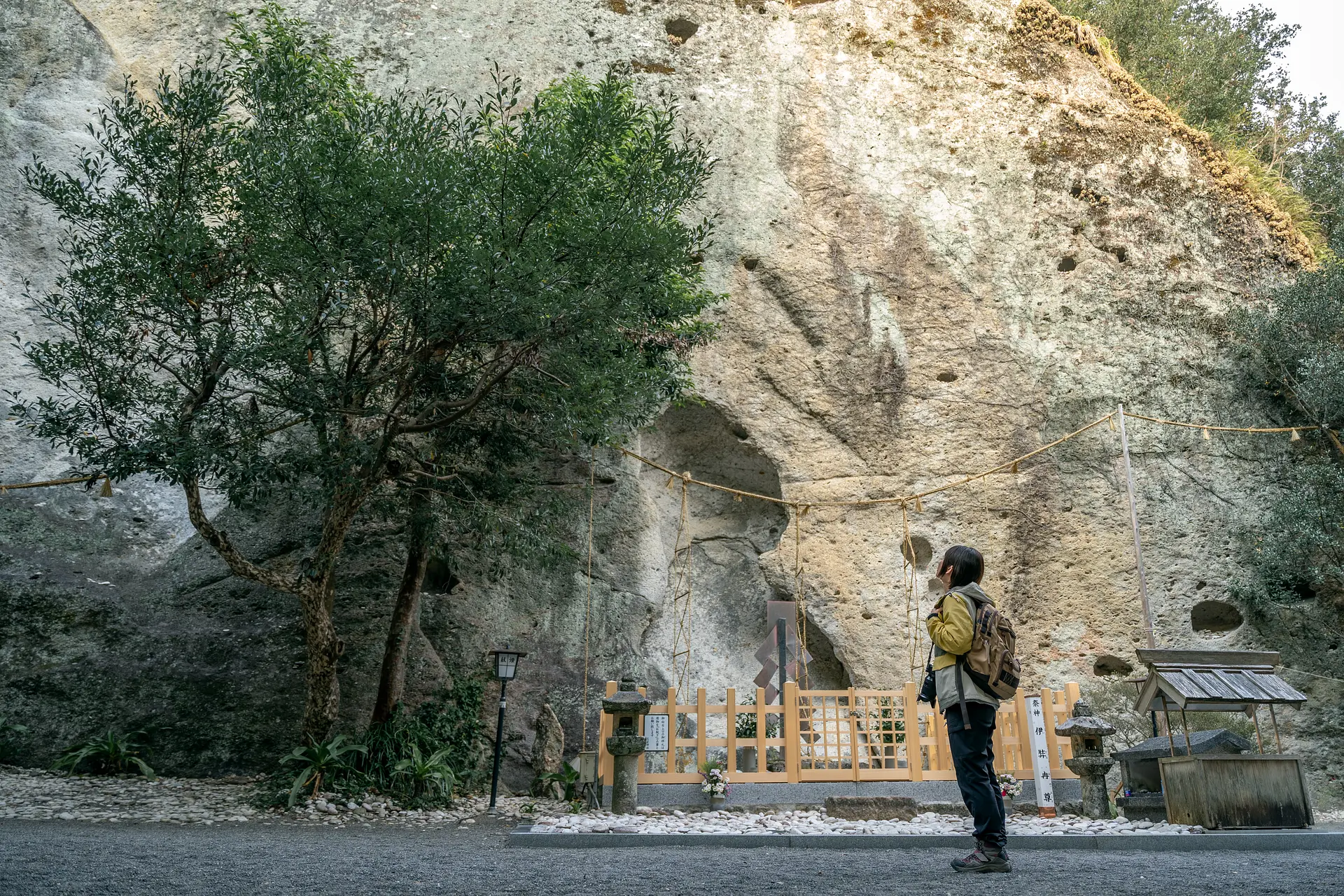 「日本書紀」に登場する花の窟には、「国生み」「神生み」の神である「伊弉冉尊(イザナミノミコト)」と、その子である「軻遇突智尊(カグツチノミコト)」が祀られています。ご神体は高さ約45メートルの立派な磐座(いわくら)で、イザナミノミコトがカグツチノミコトを生む際に火傷を負って亡くなってしまい、葬られた墓所であるとされています。