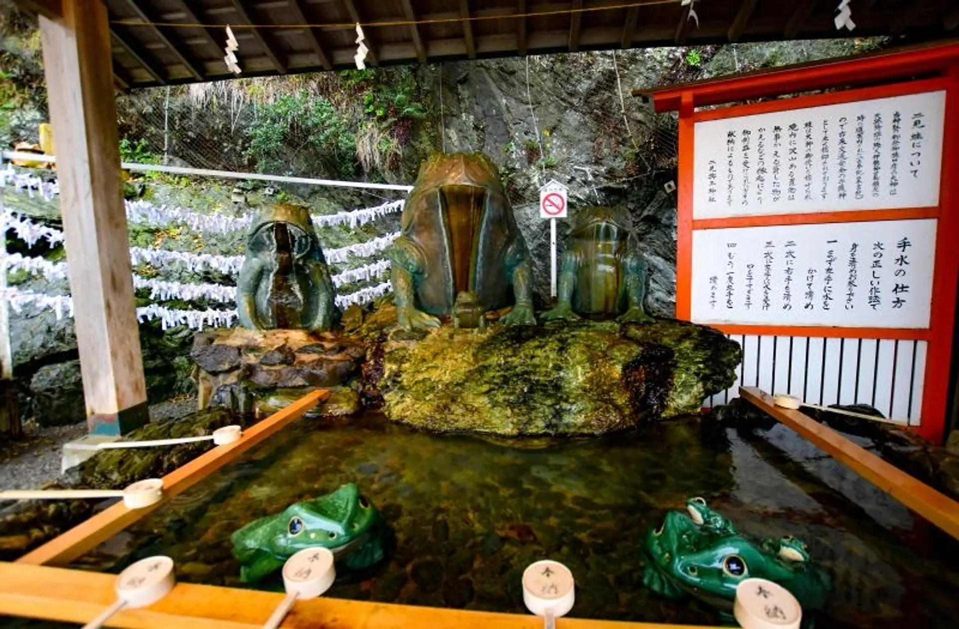 境内には御祭神のお使いとされる二見蛙が多数奉献されており、「無事にかえる」「お金がかえる」という意味があるそうです。