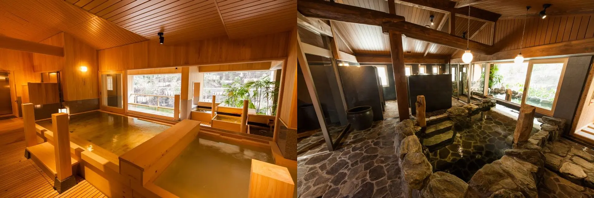 木の温もりがあふれる「社(やしろ)の湯」と、岩風呂である「森の湯」があり、お湯は新美里温泉(しんみさとおんせん)の「長寿の湯」が使用されています。滑らかな肌触りの泉質が特徴で、湯上り後はお肌がつるつるになり、保温効果が抜群!女性に絶大な人気があるそうです。