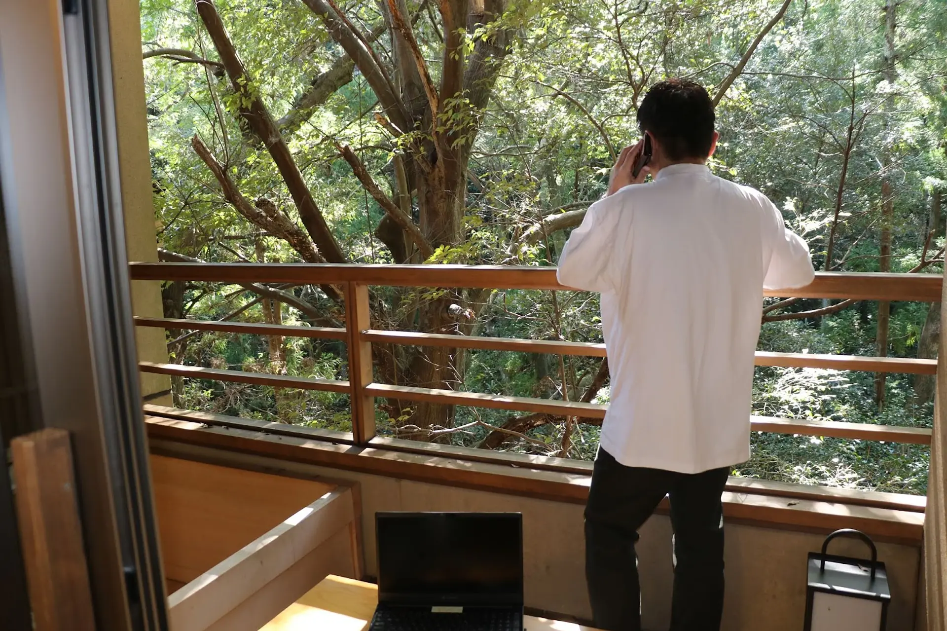 バルコニーの外には神宮の森が広がっていて、心地よい木漏れ日と澄んだ空気を感じながら電話をするなんてことも出来ちゃいますね。