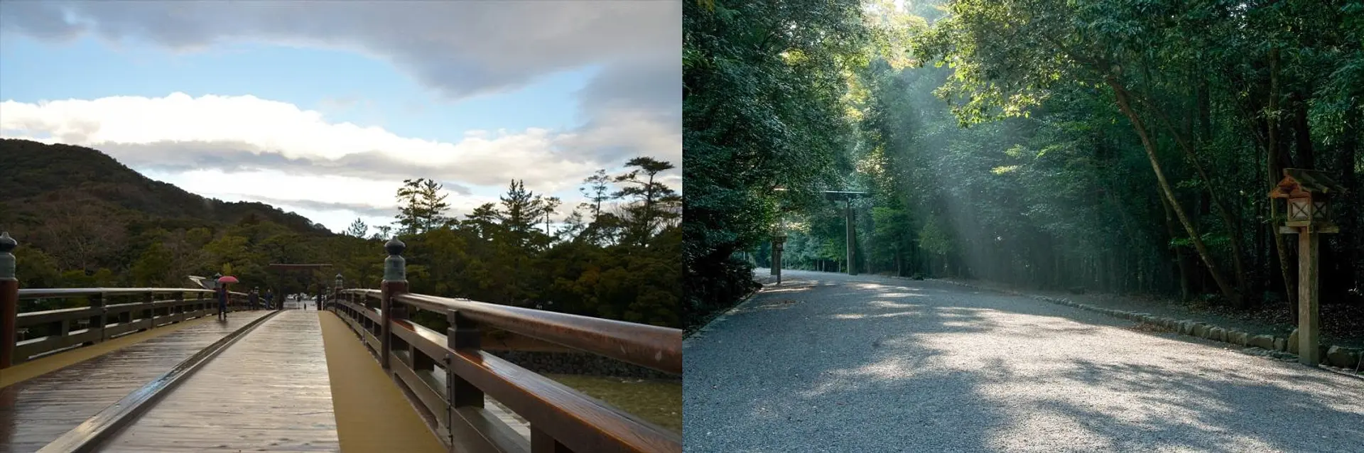 「夕間詰め(ゆうまづめ)」での参拝は、昼間とは違った静けさが漂い、しっかりと心を清めるのに最適な時間帯。内宮の玄関口である宇治橋を渡り、大きな木々の広がる参道を歩いて正宮を目指します。