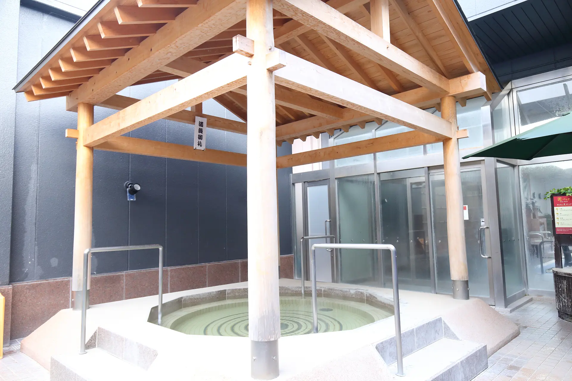 土俵風呂は、元幕内力士が監修したという相撲情緒溢れる屋根が日差しを遮ってくれるので、肌が敏感な女性も安心して長湯を楽しめます。