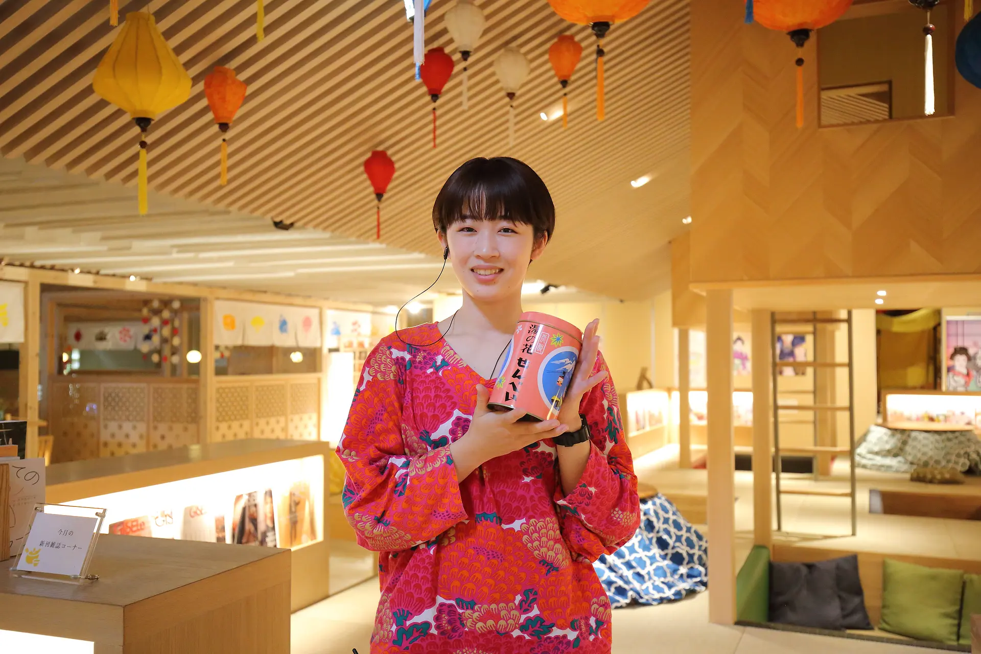 数多い三重のお土産の中でも素朴な味わいで人気の高い「湯の花せんべい」を手にするスタッフの片岡さん。三重県に赴任してまだ1年足らずですが「私たち若い社員の意見も積極的に取り入れてくれます」と、湯守座の社風にすっかり馴染んでいる様子です。