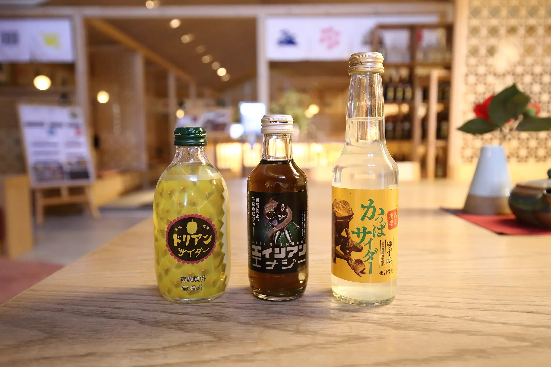 全国から集められた各種ご当地サイダーが味わえるのも楽しみのひとつ。その中には、いわゆる“変わり種”もたくさんあります。今回は「エイリアンエナジー」「かっぱサイダー」「ドリアンサイダー」(各260円)をピックアップ。