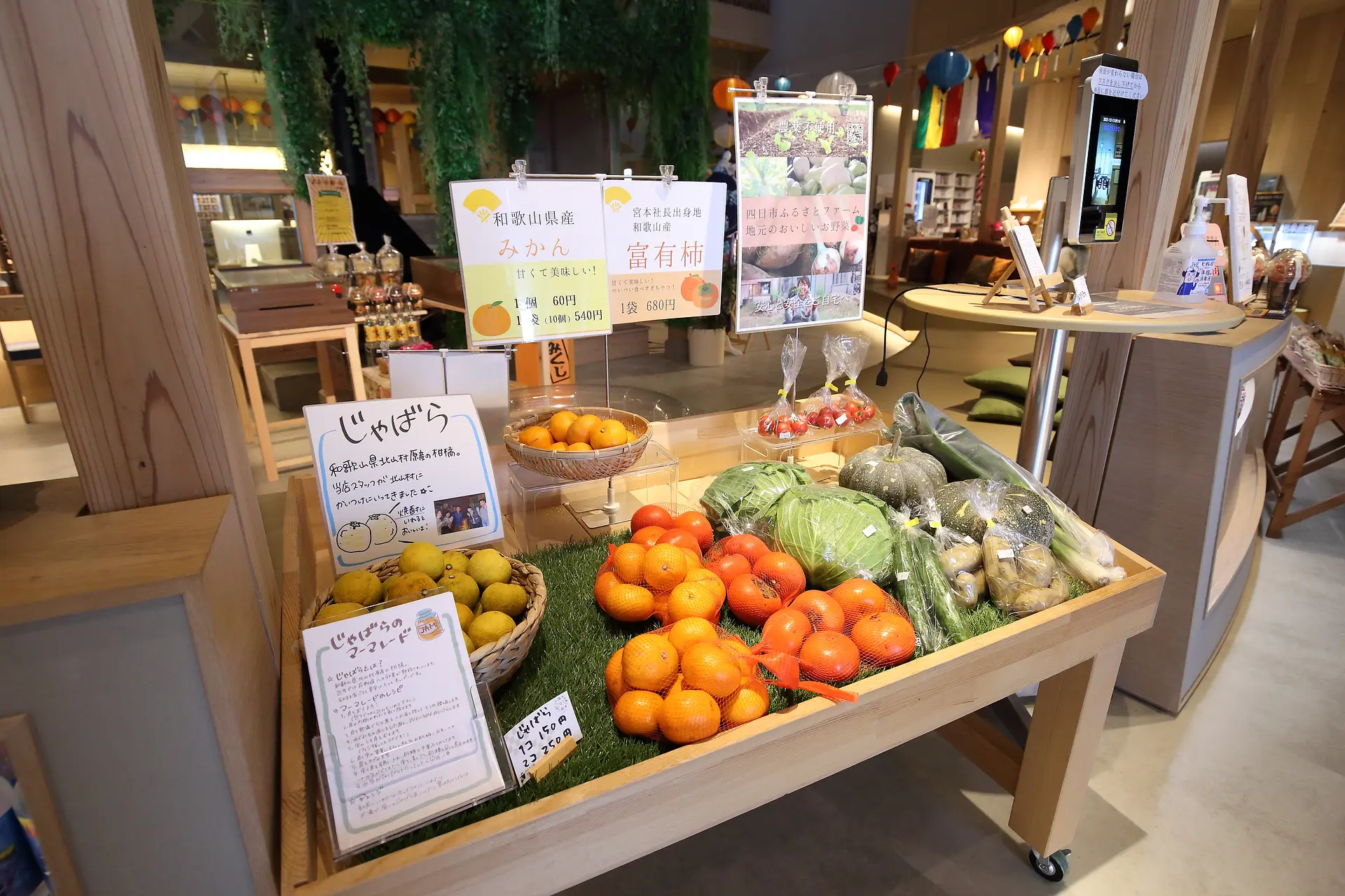 地元の産直野菜や、スタッフが現地まで足を運んで買い付けたこだわり果物などが購入できるコーナーも設けられています。