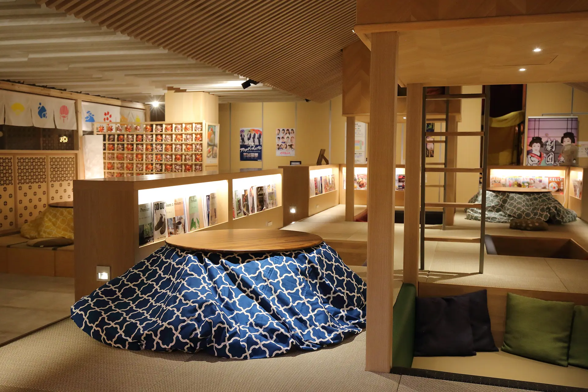 こたつに入るのもよし、寝そべってもよし。無料の挽きたてコーヒーを口にしつつ、好きな本を手に取って…。心も身体も開放して、心地よい時を過ごしましょう。