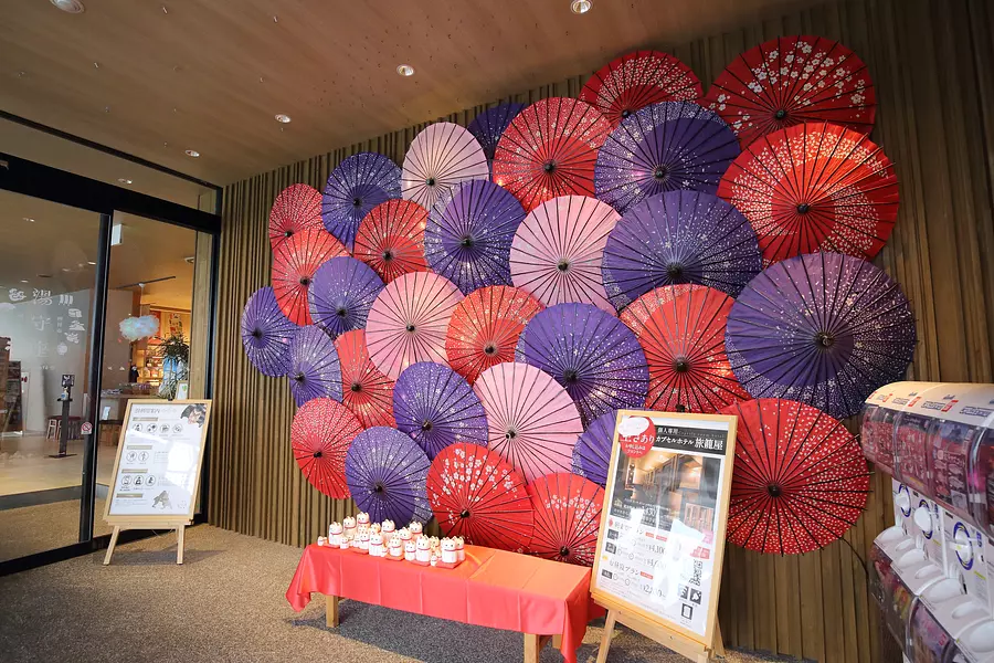 というわけで、いっぱいの和傘、和傘、和傘で彩られた湯守座エントランスへ。