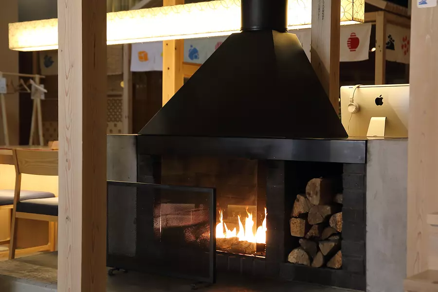 行燈タワーの入り口付近に設けられている暖炉。ゆらゆら揺れるオレンジ色の炎を眺めていると、何だか落ち着いた気分になりますね。