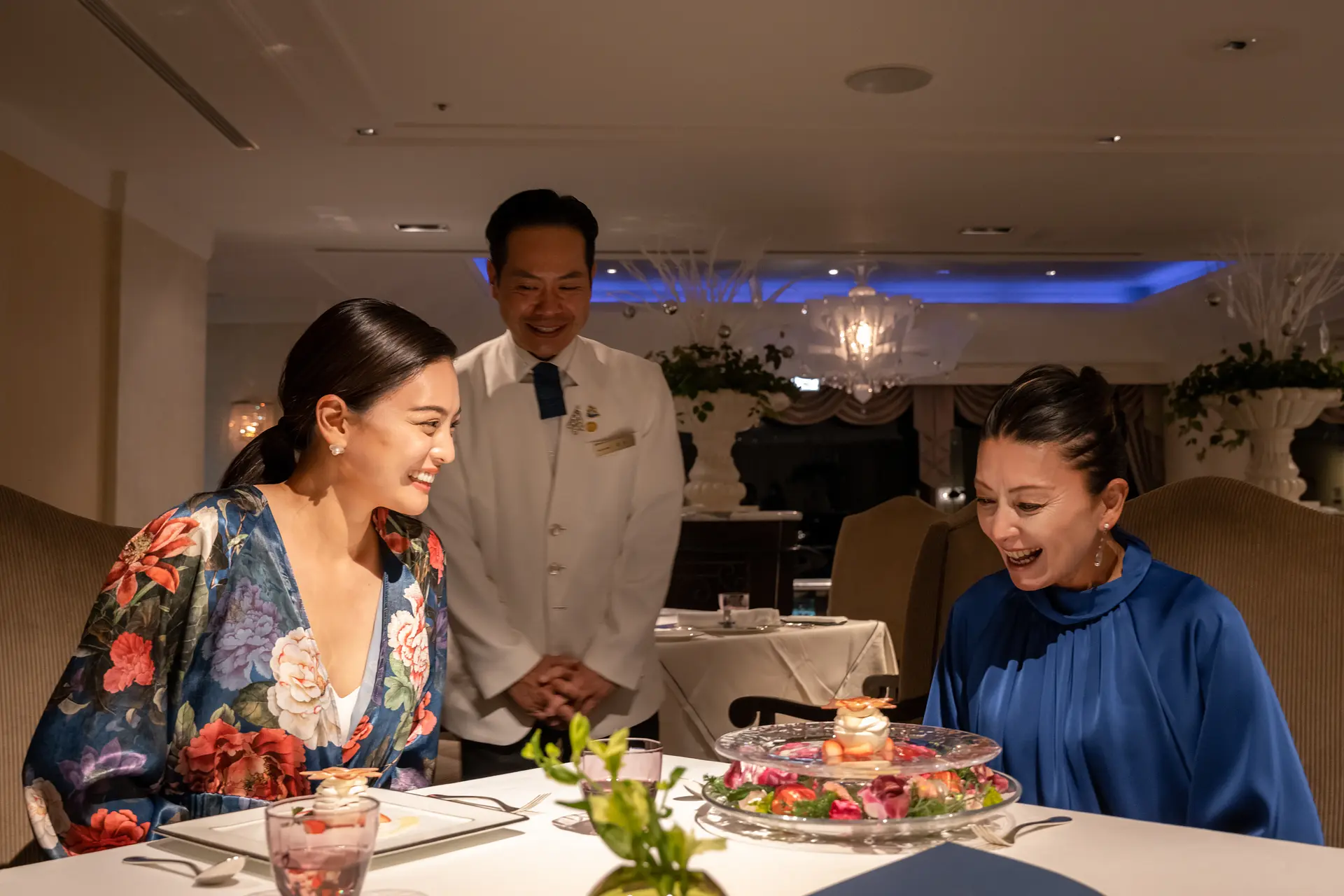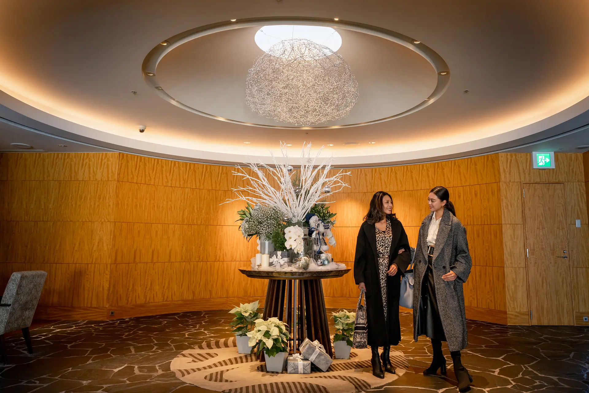 ふたりがホテルを訪れたのは12月だったため、ロビーにはクリスマス仕様の美しいオブジェが飾られていました。見上げると真珠のシャンデリア、なんとここには9,000粒もの英虞(あご)湾の真珠が使用されているそう。